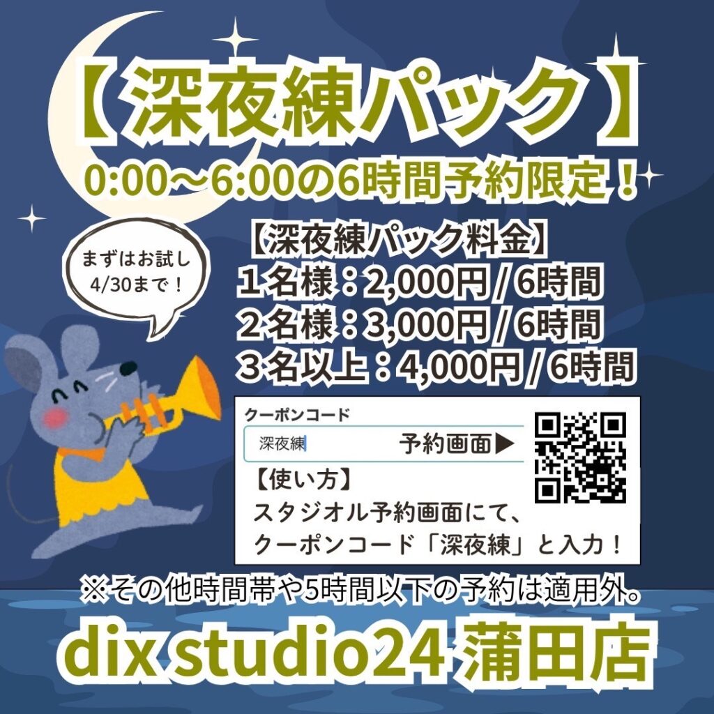 【深夜練パック】深夜0:00~6:00限定お得にスタジオ利用… 続きを読む: 《期間限定!4/30まで!》お得な【深夜練パック】実施中!dix studio24蒲田店