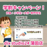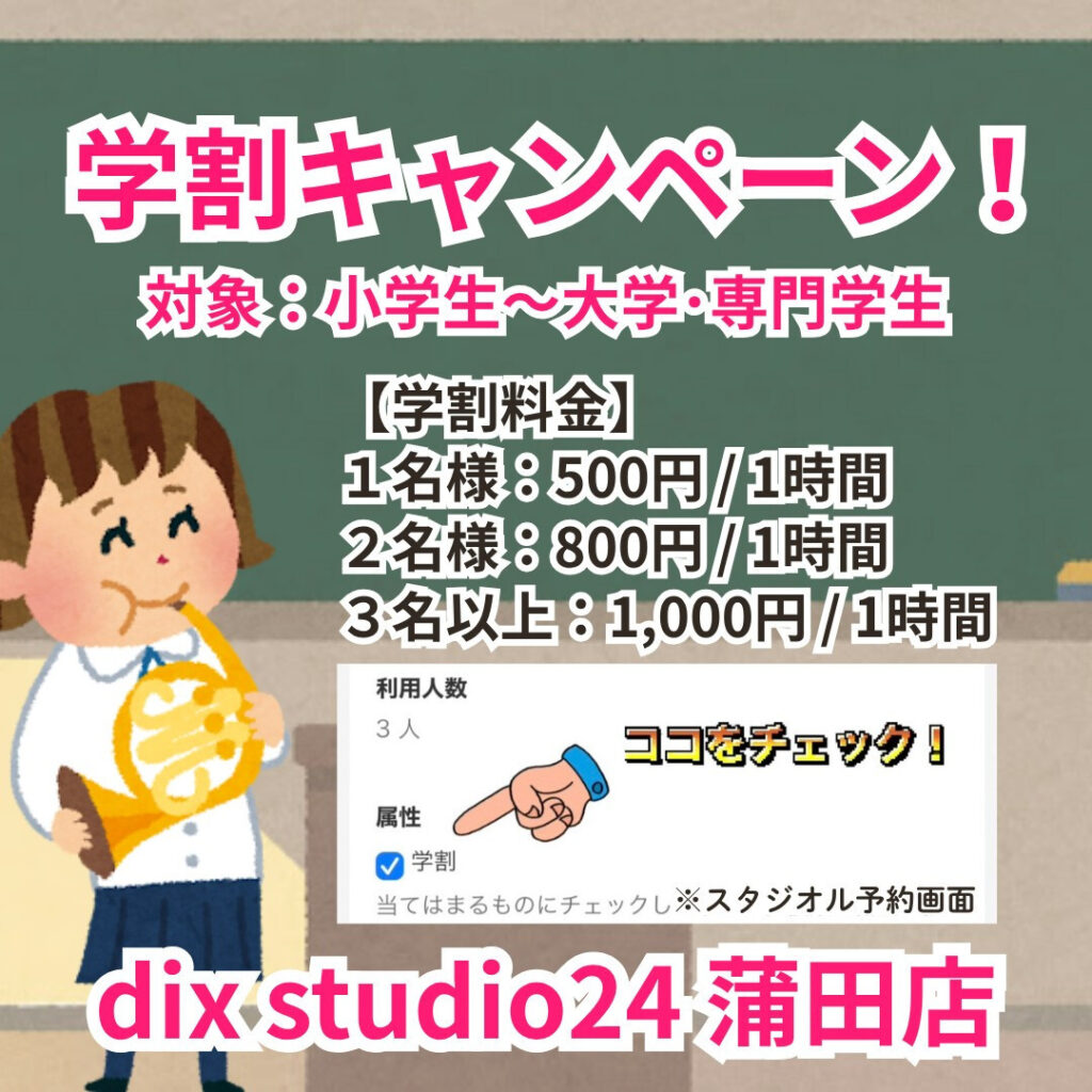 学割キャンペーン実施中! 学生のみなさんを応援します🎺 di… 続きを読む: 『学割キャンペーン』開催中!通常料金より100円以上お得♪ - 《期間限定!4/30まで!》お得な【深夜練パック】実施中!dix studio24蒲田店